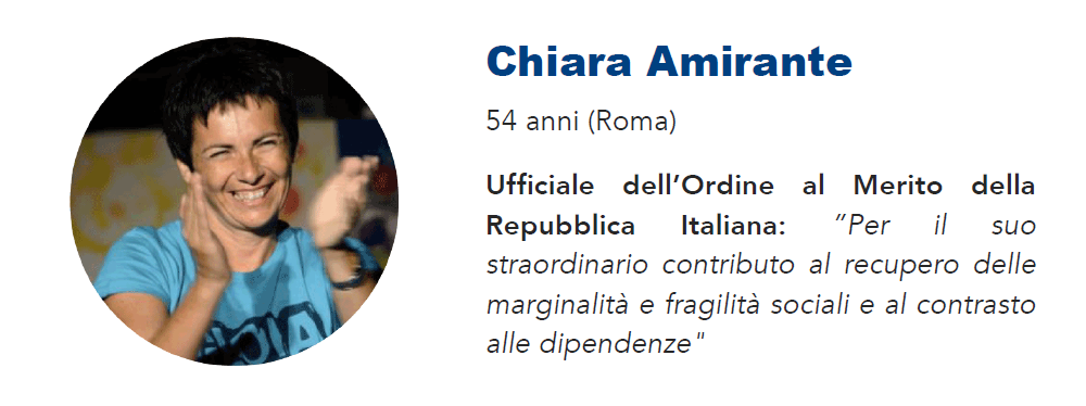 Dallo "Spiderman in corsia" al testimone dell'eccidio di Sant'Anna di Stazzema - Mattia Villardita, 27 anni (Savona) da tre anni, travestito da Spiderman, fa visita ai piccoli pazienti dei reparti pediatrici della Liguria. È il fondatore di Supereroincorsia, un gruppo di giovani impegnati nel volontariato. "Ho dei problemi di salute sin dalla nascita - racconta -, quindi sono sensibile all'argomento". Enrico Pieri, di 86 anni (Sant'Anna di Stazzema - LU), è invece stato scelto "per l'impegno, di tutta una vita, a favore della tutela della memoria, della diffusione della conoscenza storica e della difesa dei principi alla base della convivenza democratica". Superstite e testimone dell'eccidio di Sant'Anna di Stazzema: aveva dieci anni il 12 agosto del '44 quando, nascosto sotto la scala vide morire per mano nazista i genitori, due sorelle, nonni, zii e cugini. E' nato in Marocco ma palermitano di adozione, Rachid Berradi, che ha ottenuto l'onorificenza per "la sua appassionata promozione di una cultura della legalità e per il contributo al contrasto all'emarginazione sociale". E' Appuntato Scelto dell'Arma dei Carabinieri in servizio presso il Comando Provinciale di Palermo ed è stato un protagonista dell'atletica leggera italiana: mezzofondista, campione europeo nei 10.000 metri e finalista alle Olimpiadi di Sydney.