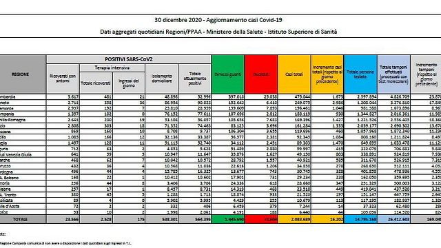 I numeri della pandemia Il tasso di positività odierno sale al 9,58% (+0,9% rispetto a martedì). Attualmente in Italia sono positive 564.395 persone, 4.333 in meno di ieri. Il numero dei pazienti ricoverati in terapia intensiva scende di 21 unità (2.528 in tutto) nonostante i 175 nuovi ingressi delle ultime 24 ore. Il numero di ricoverati con sintomi in Italia scende a 23.566 unità (-96 rispetto a ieri).