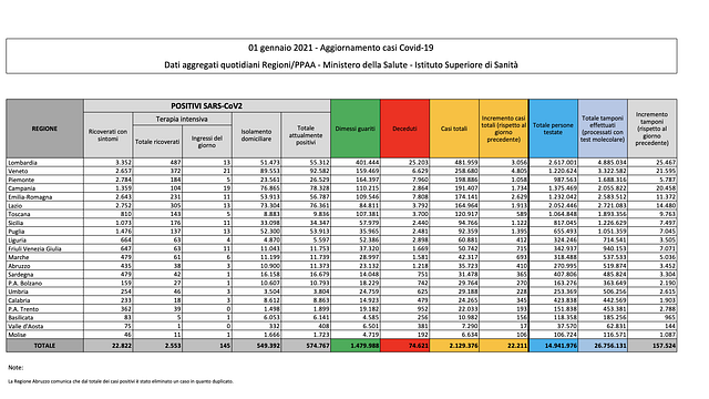 Sono 22.211 i nuovi casi di coronavirus in Italia a fronte di 157.524 tamponi eseguiti. Il tasso di positività risale ancora al 14,1% (ieri si attestava al 12,6%). Nelle ultime 24 ore le vittime sono state 462, per un totale di 74.621 dall'inizio della pandemia. Tornano a calare i ricoveri negli ospedali: sono 329 i pazienti in meno nelle ultime 24 ore. Lieve calo anche nelle terapie intensive con 2 ricoveri in meno per un complessivo di 2.553.