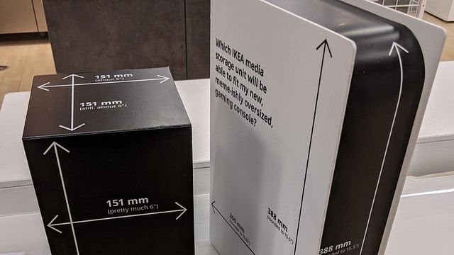 I due cartonati di IKEA non emulano soltanto il design di PS5 e Xbox Series X, ma replicano anche le dimensioni effettive delle due console, arrivando nel caso dell'ammiraglia di Sony ad ampliare leggermente la parte inferiore per essere certi che, una volta acquistato un mobile, ci sia effettivamente spazio per far "respirare" la piattaforma ed evitare così surriscaldamenti.