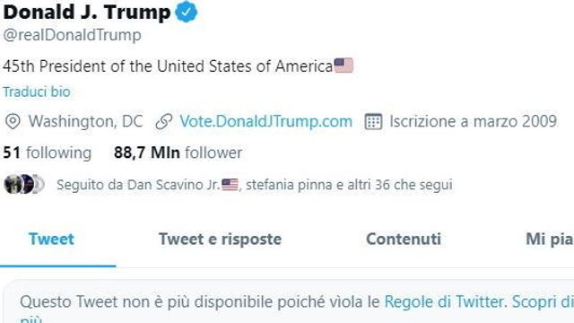 I social bloccano gli account di Trump durante l'assalto al Campidoglio degli Stati Uniti. Dopo che il presidente uscente aveva ripetutamente pubblicato false accuse sulle elezioni che hanno premiato Biden, Facebook e Twitter sospendono le sue pagine e tutti i social, compresi Instagram e YouTube cancellano il suo video appello ai sostenitori. Trump ha poi rimosso tre tweet per riprendere il controllo degli account.