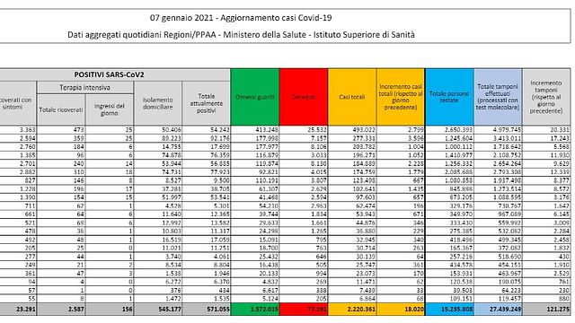 Terapie intensive Tornano dunque a salire i ricoveri sia in terapia intensiva sia nei reparti ordinari. Secondo i dati del ministero della Salute, sono 2.587 i pazienti ricoverati in terapia intensiva, 16 più di ieri nel tra ingressi e uscite. Gli ingressi giornalieri sono 156. Nei reparti ordinari degli ospedali ci sono invece 23.291 pazienti, 117 in più nelle ultime 24 ore. Gli attualmente positivi sono 571.055, rispetto a mercoledì 2.343 in più, mentre i guariti e i dimessi in un giorno sono 15.659 per un totale dall'inizio dell'emergenza di 1.572.015.