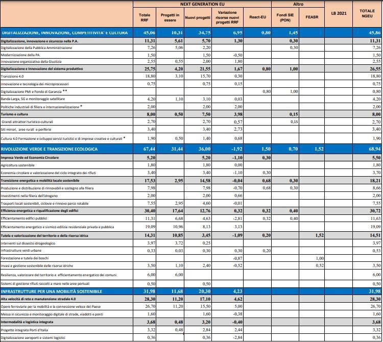 Per la transizione ecologica sul piatto 68,9 miliardi - Nella bozza del piano di ripresa e resilienza elaborata dal governo ben 68,9 miliardi sono destinati a "Rivoluzione verde e transizione ecologica". "La prima componente, 'Agricoltura Sostenibile ed Economia Circolare' - si legge nel testo inviato alle forze di maggioranza -, si articola su due linee progettuali. La prima punta a conseguire una filiera agroalimentare sostenibile, migliorare la competitività delle aziende agricole e le loro prestazioni climatico-ambientali, a potenziare le infrastrutture della logistica del comparto. La seconda linea punta alla realizzazione di nuovi impianti, in particolare nelle grandi aree metropolitane del Centro e Sud Italia, per la valorizzazione dei rifiuti al fine del completamento del ciclo e all'ammodernamento di quelli esistenti in linea col Piano d'azione europeo per l'economia circolare".