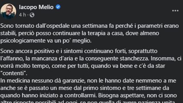 L'esperienza è stata dolorosa per il consigliere regionale del Pd che alle passate elezioni aveva fatto il pieno di voti. Seguito per il suo indiscusso impegno sociale e civile, Melio torna a scrivere dopo un lungo silenzio: "Sono ancora positivo e i sintomi continuano forti, soprattutto l’affanno, la mancanza d’aria e la conseguente stanchezza. Insomma, ci vorrà molto tempo, come per tutti, quando va bene e c’è da star “contenti”. In medicina nessuno dà garanzie, non le hanno date nemmeno a me anche se è passato un mese dal primo sintomo e tre settimane da quando hanno iniziato a controllarmi. Bisogna aspettare, non ci sono altre risposte possibili ad oggi, se non quella di avere pazienza unita alla speranza di aver fatto il giro di boa.