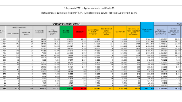 Guariti e dimessi - In totale i casi da inizio epidemia sono 2.368.733. Gli attualmente positivi sono 557.717 (-351), i guariti e i dimessi 1.729.216 (+16.186), in isolamento domiciliare ci sono 532.413 persone (-292).