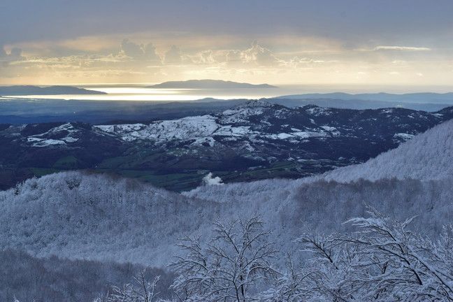 Pellegrini e briganti sono la nostra ispirazione per l’itinerario; il nostro viaggiatore parte da Abbadia San Salvatore, paese di antica origine che prende nome dall’abbazia di costruzione longobarda (743 d.C.) di cui ancora oggi sui possono visitare la Chiesa (rimaneggiata) e la cripta, un grande corridoio che scorre fra trentacinque colonne – di cui 24 completamente originali - dalle forme singolari, decorate da capitelli ricchi di motivi vegetali e simbolici. Siamo in posizione strategica, sulla via Francigena ed è forte l’atmosfera dei secoli misteriosi che qui si avverte: in questa Abbazia fu custodita per mille anni la più antica copia manoscritta della Vulgata, il Codex Amiatinus, antica traslatio latina della Bibbia corretta da San Girolamo. Adesso è conservata alla Biblioteca Laurenziana a Firenze. Dal paese si seguono le indicazioni per la vetta del Monte Amiata, un percorso ad anello per circa 5 ore di cammino, forse qualcosa in più per la neve che rallenta il passo: con scarponi o meglio ancora con le ciaspole ci si addentra in una fitta faggeta fino al rifugio Cantore (1420m), passando dal Prato delle Macinaie (dove si trova un divertente parco avventura, l’IndianaPark Amiata, da provare quando la stagione lo consentirà) e poi, seguendo il segnavia bianco e rosso, provando a percorrere la pista da sci (attualmente chiusa agli sciatori) si raggiunge la grande croce monumentale, a quota 1728m. Ancora un po’ di fiato per arrivare qualche metro più su, a quota 1738, per contemplare il più bel panorama della Val d'Orcia: si vede Siena, il lago di Bolsena, il Terminillo, il mare e l’arcipelago toscano (www.amiataneve.it).
