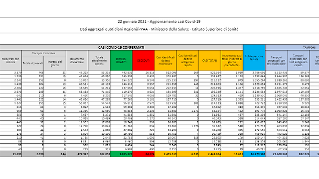 In Italia ci sono 13.633 nuovi casi di coronavirus a fronte di 264.728 test tra molecolari e antigenici (il giorno prima l'incremento era stato di 14.078 su 267.567 test). I casi complessivi arrivano così a quota 2.441.854. Nelle ultime 24 ore sono stati registrati 472 decessi (contro i 521 di giovedì) per un totale, da inizio pandemia, che arriva a 84.674. Il tasso di positività è stabile al 5,1% (giovedì era al 5,2%).