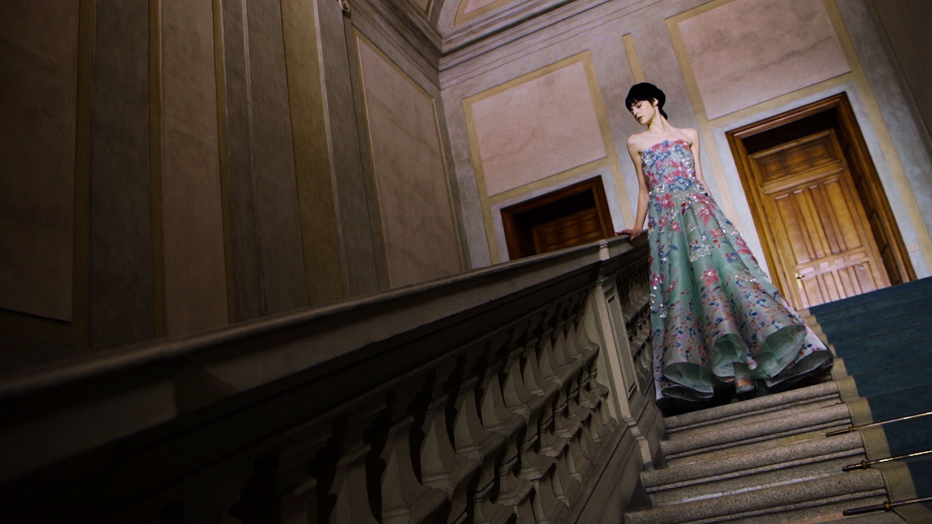 UNA GIOIA NUOVA – Tutto è leggerezza, tutto è colore e una gioia nuova. Tra fluidità e perfezione delle proporzioni, gli opposti si alternano e si fondono. Giacche disegnate sul corpo e delicati abiti-sottoveste ricamati, sensuali tuniche scivolate di satin e abiti voluminosi ricoperti di cristalli. Tessuti gessati dalla texture maschile e lamé dai riflessi oro grigio, raso e organza, tulle e seta lavata, definita da balze e tocchi di velluto blu notte. I colori: rosso magenta e verde acqua, blu di prussia e blu cobalto, grigio e greige. Su tutto risplende il bagliore di microcristalli e paillettes che rivelano l’abilità artigianale e l’accuratezza nell’esecuzione.