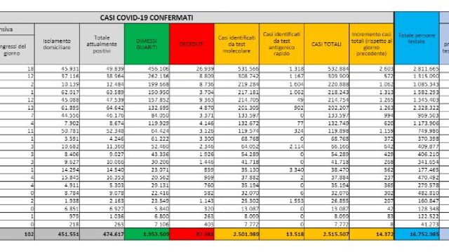 I numeri della pandemia Il tasso di positività odierno è del 5,2%, in leggera risalita rispetto al 5,17% di mercoledì quando i tamponi processati erano stati 293.770. I ricoveri in terapia intensiva sono in calo di 64 unità nel saldo tra entrate e uscite rispetto a ieri, mentre gli ingressi giornalieri sono 102. In totale in Rianimazione ci sono 2.288 persone. Nei reparti ordinari sono invece ricoverati 20.778 pazienti, -383 unità rispetto a ieri. Gli attualmente positivi sono 474.617 (i-3.352 in 24 ore). Sono invece 1.953.509 i pazienti dimessi o guariti (+17.220). In isolamento domiciliare ci sono infine 451.551 persone (-2.905).