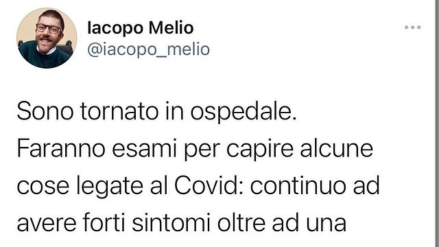"Da mercoledì sono in ospedale. - ha raccontato dopo l'annuncio del nuovo ricovero via Twitter, Melio sulla sua pagina di Facebook. - Faranno esami e accertamenti per capire alcune cose legate ai sintomi del Covid, che continuano a essere forti, e a una perdita di peso importante che dovrò tenere sotto controllo e recuperare il prima possibile, ritornando a mangiare cibo normale, dato che al momento è più di un mese che vado avanti soltanto a integratori liquidi, a causa della tosse e di problemi di deglutizione".