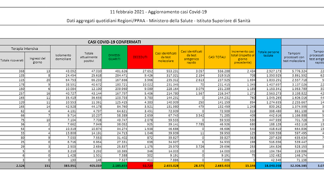 I numeri della pandemia Le persone attualmente positive sono 405.019 (-5.092). Di questi, 383.951 si trovano in isolamento domiciliare, 18.942 sono ricoverati con sintomi, 2.126 sono in terapia intensiva: 151 gli ingressi del giorno. Mentre i guariti o dimessi sono 2.185.655 (+19.838 rispetto a ieri).