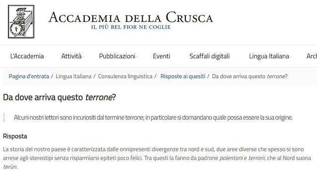 E comunque la Crusca si appresta anche a scrivere una memoria difensiva in vista dell'udienza del prossimo settembre al Tribunale civile di Nocera Inferiore (Salerno). Anche se, osserva Marazzini, resta da chiarire se questo sia davvero il foro competente per discutere l'atto di citazione, dal momento che l'Accademia ha sede a Firenze. "Noi riteniamo che una causa civile contro l'Accademia della Crusca non abbia ragione di esistere, perché insensata - osserva sempre Marazzini - Certo, quando ci si rivolge ai tribunali poi bisogna vedere come va a finire. Peraltro, nella voce stilata dalla Consulenza della Crusca che si pretende di incriminare c'è proprio un giudizio morale, che ne sottolinea l'uso offensivo e discriminatorio che ne è stato fatto". A finire "incriminato" è, infatti, il parere intitolato "Da dove arriva questo terrone?" pubblicato nel 2017 sulla pagina web della Crusca dopo che alcuni lettori si erano detti incuriositi dal termine "terrone", chiedendo in particolare quale fosse la sua origine.
