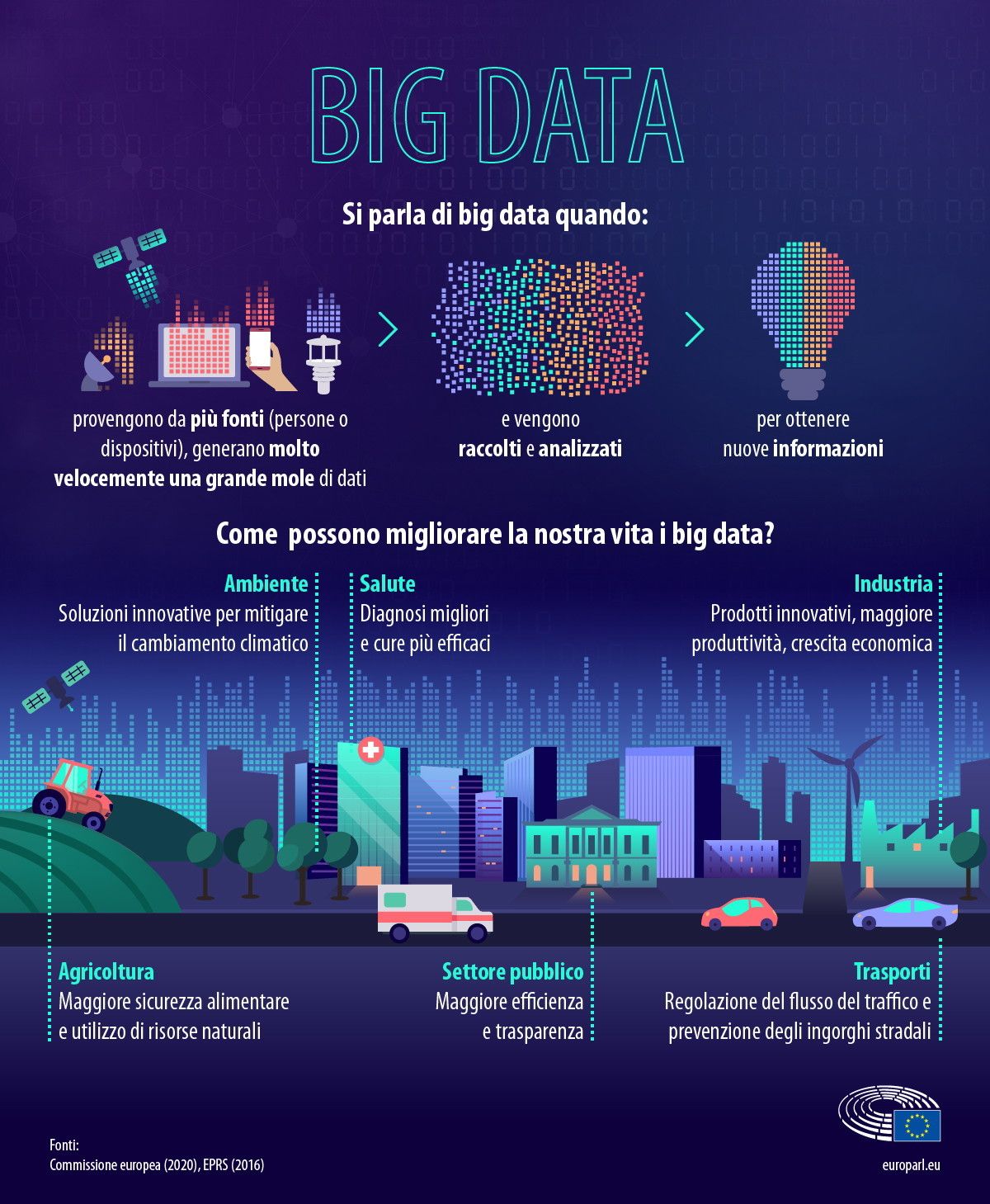 Dire "big data" significa armeggiare un argomento complesso e dibattuto, una grande opportunità per il presente e per il futuro e al tempo stesso una risorsa che va gestita e usata al meglio per far andare in porto i grandi obiettivi dell'Unione europea (Green Deal, uso dell'intelligenza artificiale, transizione digitale). Grandi poteri, grandi responsabilità: quelle invocate dal Parlamento Ue affinché regolamentazione e legislazione sul tema nascano sotto il segno di due valori dell'Ue, ovvero privacy e trasparenza.