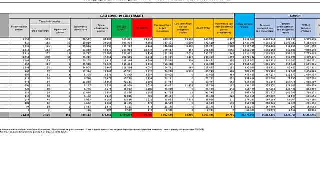 Sono 20.765 i casi di Covid nelle ultime 24 ore, secondo i dati comunicati dal ministero della Salute, su un totale di 271.336 tamponi, mentre si contano 207 morti. I guariti sono 13.467, mentre salgono ancora i ricoveri: 443 in più nei reparti ordinari e 34 nelle terapie intensive. Gli attualmente positivi sono 7.050 in più: in tutto 472.862, il 94,98% dei quali in isolamento domiciliare.