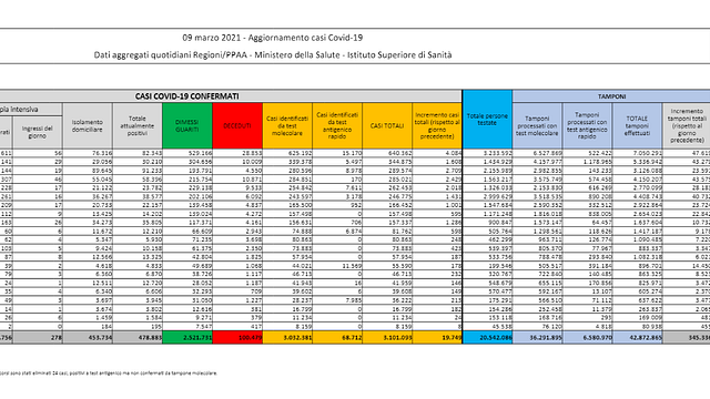 In Italia ci sono 19.749 nuovi casi di coronavirus a fronte di 345.336 tamponi effettuati (mentre il giorno prima l'incremento era stato di 13.902 su 184.684 test). Nelle ultime 24 ore sono stati registrati altri 376 decessi (contro i 318 di lunedì) per un totale, da inizio pandemia, che arriva a 100.479. In terapia intensiva sono ricoverati 2.756 pazienti (+56). La Regione col maggior incremento di casi è la Lombardia: +4.084.