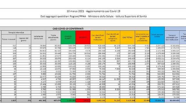 Gli attualmente positivi sono 487.074., di cui 461.365 si trovano in isolamento domiciliare, 22.882 sono ricoverati con sintomi. Sono 5.782.615 le dosi di vaccino somministrate in totale.