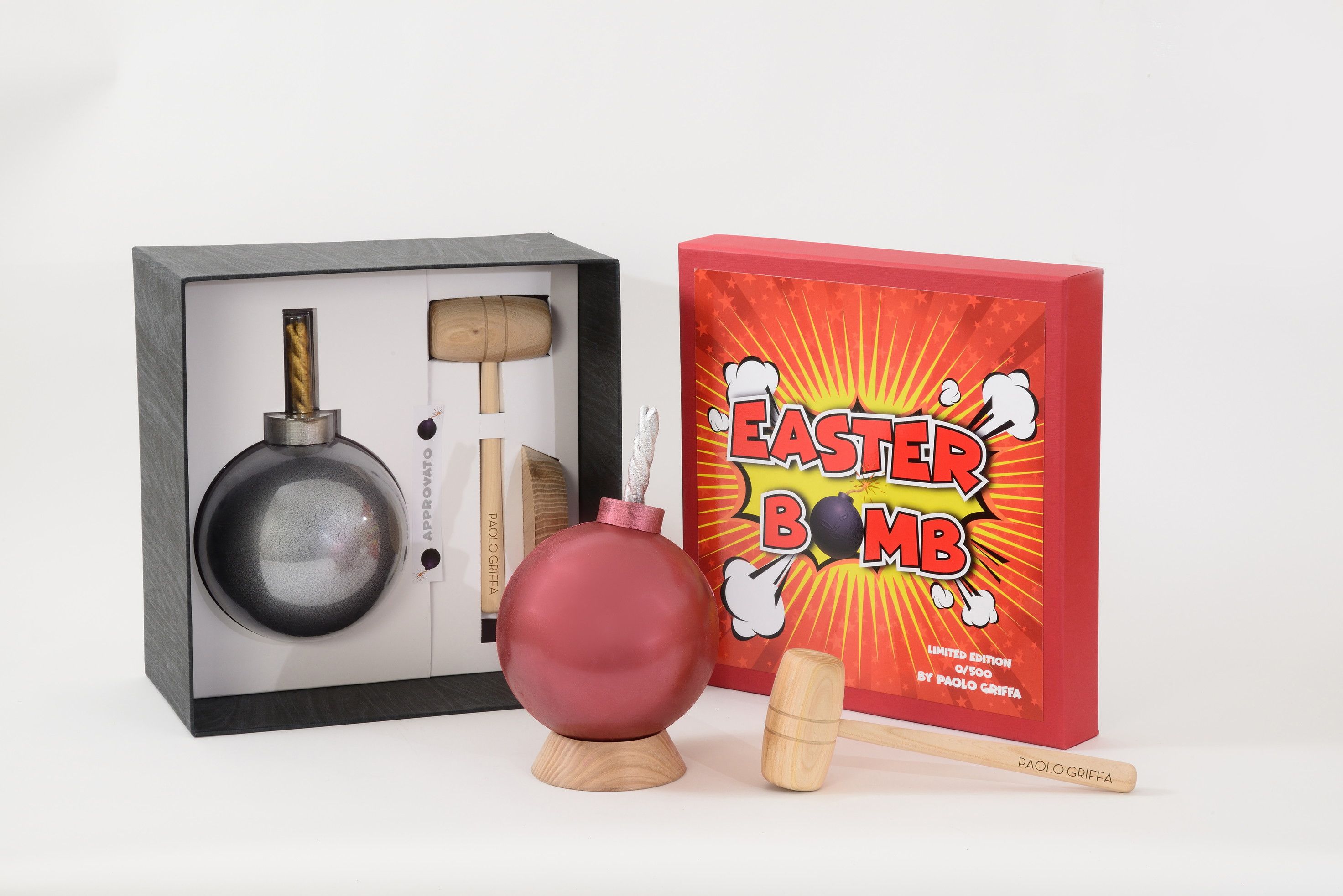 Per questa Pasqua 2021 così diversa, Paolo ha ri-pensato il BoomBolone con una linea di uova inedite: l’Easter Bomb, una creazione pasquale di Cucina Ludica. Un uovo bomba, una pièce di cioccolato fondente colorato alta 25 cm per circa 750 kg proprio a forma di bomba, confezionata in una box disegnata da Paolo stesso. L’Easter Bomb si sviluppa a partire da un concetto e pregiudizio visivo, associato alla strumentazione fornita: il martello di legno valdostano tornito a mano, che esplicita l’atto che seguirà, ovvero la rottura dell’uovo seguito da un suono di scoppio - ma in bocca, durante la degustazione!