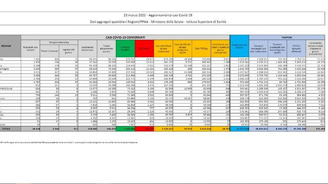 I numeri della pandemia Secondo i dati del ministero della Salute, sono 3.546 i pazienti ricoverati in terapia intensiva per Covid in Italia, 36 più di ieri nel saldo giornaliero tra entrate e uscite, mentre gli ingressi giornalieri in rianimazione sono 317 (lunedì erano stati 227). Nei reparti ordinari sono invece ricoverate 28.428 persone, con un incremento di 379 unità nelle ultime 24 ore. Un dato giornaliero così alto di vittime (551) non si registrava dal 19 gennaio, quando i morti per Covid furono 603. Gli attualmente positivi sono 560.654, in calo di 2.413 rispetto a ieri. Dall'inizio della pandemia sono invece 2.753.083 i guariti e i dimessi, con un incremento nelle ultime 24 ore di 20.601. In isolamento domiciliare ci sono 528.680 persone (-2.828 rispetto a ieri).