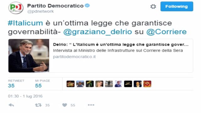 Le modifiche alla legge elettorale non si faranno. Non le vuole il M5s, che ha ribadito di avere "altre priorità" per il Paese, e non le vuole nemmeno il Partito democratico. Nel giorno in cui alcuni sondaggi danno i pentastellati in vantaggio sul Pd, spazzano via ogni dubbio prima Graziano Delrio, poi lo stesso Matteo Renzi, che ritwitta l'intervista del ministro delle Infrastrutture rilasciata al Corriere della Sera: "L'Italicum è un'ottima legge che garantisce governabilità". Fine della questione.