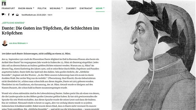 In occasione del Dantedì, la giornata nazionale dedicata a Dante Alighieri, un giornale tedesco, il Frankfurter Rundschau, ha pubblicato un lungo articolo dedicato al Sommo Poeta. Non si tratta però di un omaggio. Nell'editoriale, a firma di Arno Widmann, si legge infatti: "Dante Alighieri non ha inventato nulla, né il 'volgare' cioè l'italiano, né il viaggio nell'al di là descritto nella Divina Commedia, per cui non si capisce che cosa debbano festeggiare gli italiani".