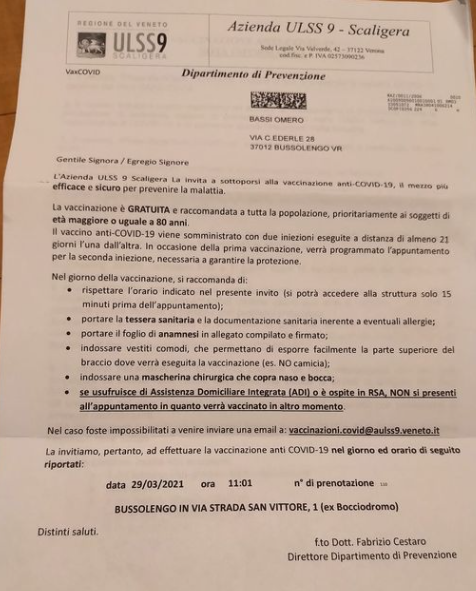 La lettera è originale, nessun falso: "La invitiamo - si legge - a effettuare la vaccinazione anti Covid-19 nel giorno ed orario di seguito riportati", e cioè il 29 marzo alle ore 11:01. Peccato però che l'intestatario della convocazione, il signor Omero Bassi, in realtà sia morto trent'anni fa. È successo a Bussolengo (Verona), dove i famigliari del defunto hanno ricevuto la comunicazione da parte dell'Ulss 9 Scaligera.