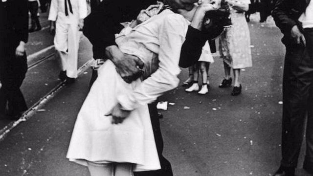La mattina del 14 agosto 1945 l'allora Greta Zimmer si recò al lavoro in un ambulatorio di Lexington Avenue tra voci insistenti della resa del Giappone dopo le bombe a Hiroshima e Nagasaki. Greta uscì per saperne di più e, una volta a Times Square, si sentì afferrare e baciare da un marinaio, al settimo cielo per la fine della guerra. Greta e George era ignari che a pochi passi c'era Alfred Eisenstaedt, il fotografo di Life, pronto col suo obiettivo a catturare il momento.