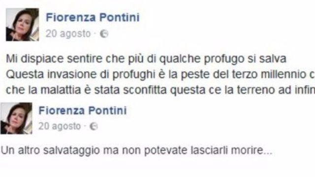 "Mi dispiace sentire che più di qualche profugo si salva". E' una delle frasi shock entrata in Parlamento con un'interrogazione e finita sul tavolo del ministro dell'Istruzione Giannini. A scriverla un'insegnante d'inglese al Liceo Marco Polo di Venezia, Fiorenza Pontini, 59 anni, che è finita nella bufera per xenofobia contro i migranti e ingiurie contro la presidente della Camera Boldrini. Dal Miur fanno sapere che l'Ufficio scolastico del Veneto è intervenuto con due provvedimenti disciplinari e che del caso si è interessata anche la Procura.