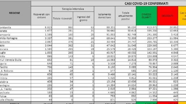 In totale i casi da inizio epidemia sono 3.607.083, mentre i decessi 109.847. Gli attualmente positivi sono 563.479 (+971 rispetto a mercoledì), mentre in isolamento domiciliare ci sono 530.849 persone (+2.462).