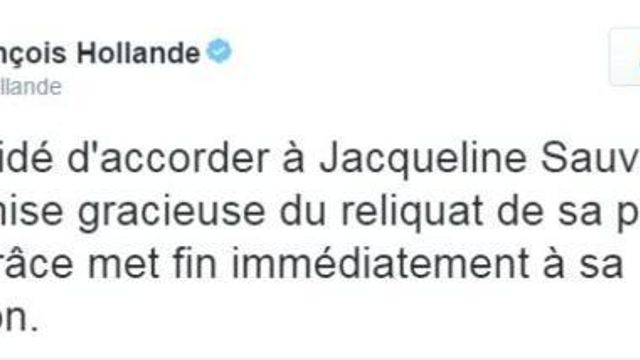 La fine della pena era fissata per il 2 luglio 2018, ma, come Hollande ha scritto su Twitter: "Ho deciso di accordare a Jacqueline Sauvage lo sconto del residuo della sua pena. Questa grazia mette fine immediatamente alla sua detenzione". In un comunicato, l’Eliseo spiega che la donna "è stata sì condannata ma è stata anche vittima di violenze per tutta la vita. È per questo che esiste il diritto alla grazia: per situazioni umane eccezionali".