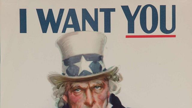 L'arma della propaganda - L'intento delle campagne di reclutamento era chiaro: arruolare quanti più uomini possibile e "motivarli" a difendere la loro patria. Da qui le composizioni "esagerate" dei manifesti, in cui la prospettiva e lo sguardo "obliquo" rompono la parete tra immagine e lettore, coinvolgendolo emotivamente. Il messaggio viene "sparato" direttamente dal dito dello zio Sam verso i nostri occhi. "La storia siamo noi" in pratica: tutti si sentono protagonisti, tutti possono diventare attori delle guerra.