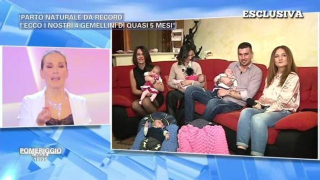Pomeriggio 5 è in provincia di Avellino per presentarci quattro gemellini, tre femmine e un maschio, nati lo scorso ottobre senza l'aiuto della fecondazione assistita. La coppia di giovani genitori oltre a raccontare il momento della scoperta della gravidanza plurigemellare e la successiva gioia di essere una famiglia, spiega le difficoltà economiche della vita di tutti i giorni: "Siamo due infermieri: lo Stato incita a fare figli, ma non ci aiuta".