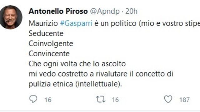 Dura polemica social dopo il tweet del giornalista Antonello Piroso contro Maurizio Gasparri in cui si allude a una "pulizia etnica intellettuale" nei confronti del senatore di Forza Italia. "Sono stato messo sotto accusa solo perché mi sono schierato contro qualsiasi forma di legalizzazione della droga, come ho sempre fatto in ogni mio intervento su questo argomento. Attaccato con parole pesantissime solo per aver ribadito ciò che ho sempre sostenuto" ha detto Gasparri a Tgcom24.