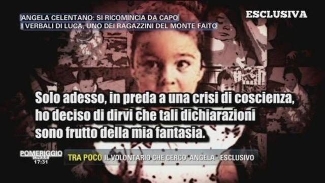 Nel corso di Pomeriggio 5, Barbara D'Urso è ritornata sul caso della socmparsa della piccola Angela Celentano, ormai introvabile da ben ventuno anni, da quel pomeriggio in cui non si seppe più nulla di lei sul Monte Faito. Nei video mostrati dalla conduttrice, i verbali con le dichiarazioni lasciate da due testimoni importanti, due ragazzini, gli ultimi ad aver visto la bambina. All'epoca dei fatti, Renato aveva 11 anni. Racconta di essere stato seguito dalla bambina mentre lui andava a riporre in auto il suo pallone. Ricorda di averle detto di andarsene, di essersi girato e di non averla vista più. La ricostruzione di Renato contrasta con quella di un altro bambino, Luca, che aveva 12 anni quando successe il fatto. Ed è proprio quest'ultimo, che aveva amesso di aver visto due uomini prendere la piccola e scappare via su una Fiat Uno nera, ad aver ritrattato la sua iniziale versione, affermando, questa volta, di non ricordare nitidamente cosa effettivamente accadde.