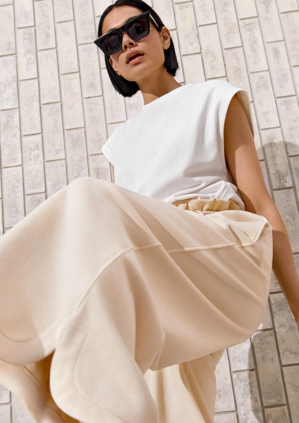 © Ufficio stampa|I capi chiave della capsule H&M Spring 2021 sono un mix di elementi anni ’90, come la felpa con cappuccio senza maniche, l'abito arricciato sul lato e il gilet in denim con taschini