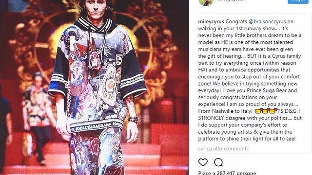Il fratello della cantante è stato scelto per sfilare sulla passerella di Milano e Miley ha postato su Instagram tutto il suo orgoglio: "Non è mai stato un sogno di mio fratello essere un modello - scrive - è uno dei musicisti più talentuosi che le mie orecchie abbiamo avuto la fortuna di ascoltare, ma è un tratto caratteristico della famiglia Cyrus provare qualsiasi cosa almeno una volta e abbracciare opportunità che ti incoraggino a fare un passo fuori dalla tua comfort zone".