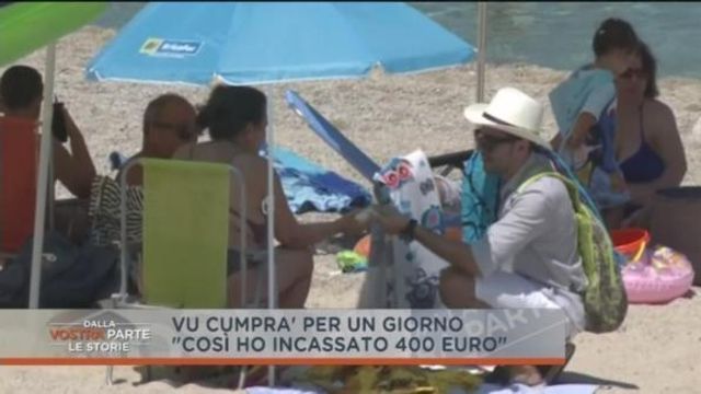 Fingersi un venditore ambulante per un giorno e tornare a casa con circa 400 euro esentasse. L'iniziativa di Michel Dessì, giornalista inviato di "Dalla Vostra Parte" ha ottenuto un risultato davvero inaspettato, considerando inoltre che si trattava di un giorno feriale. Dopo aver acquistato la merce il giornalista ha venduto abusivamente teli per il mare sulle spiagge di Tropea, in Calabria, arrivando a incassare ben 73 euro in sole due ore. Lavorando tutto il giorno con questi ritmi, si potrebbe arrivare a guadagnare quasi 400 euro, ovviamente senza dover pagare le tasse.