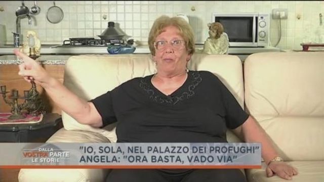 "Devo stare attenta quando apro la porta. Inoltre disturbano e non hanno orari, non danno peso al fatto che sia giorno o notte." Di fronte alle telecamere di "Dalla Vostra Parte", Angela racconta così la difficile situazione che si vede costretta ad affrontare ormai da un mese, quando in alcuni appartamenti del suo condominio sono arrivati sedici profughi, creando immediatamente una serie di disagi per gli altri abitanti dello stabile di Stanghella, in provincia di Padova. Angela non riesce ad abituarsi allo stile di vita dei nuovi arrivati, così come altri inquilini italiani che hanno già deciso di andare via. Anche la donna vorrebbe trasferirsi, ma a 75 anni e con una pensione di 950 euro non è facile trovare un altro affitto.