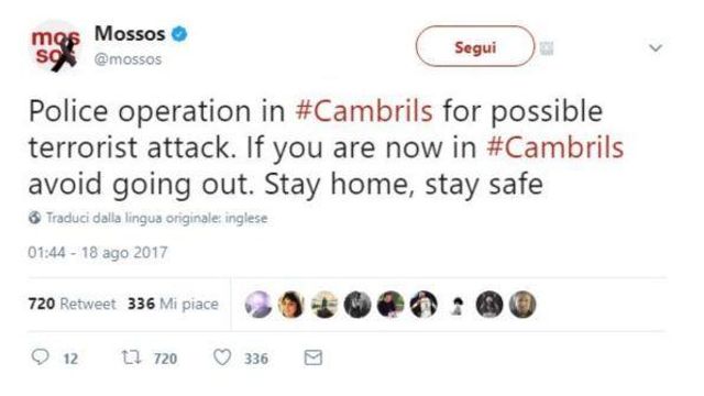 Operazione di polizia a Cambrils, in Catalogna, per un possibile attacco terroristico dopo l'attentato sulla Rambla di Barcellona. "Se siete a Cambrils, non uscite. Restate in casa, restate al sicuro", scrive su Twitter la polizia catalana.