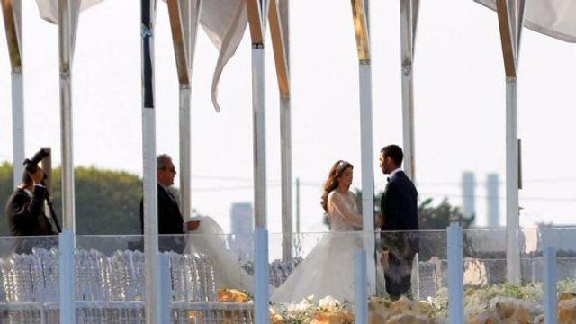 Rito ebraico - La cerimonia nuziale, di rito ebraico, religione cui appartengono gli sposini, si è svolta sulla grande piattaforma montata sulla scogliera del lido, dove è stato allestito il baldacchino "Chuppah", simbolo della casa in cui lo sposo accoglie la futura moglie. Squilli di trombe araldiche, giochi pirotecnici e spettacoli a terra e in acqua hanno animato il ricevimento sulla spiaggia che, chiusa al pubblico tra le polemiche dei residenti, è stata trasformata in un locale a metà tra una discoteca e un ristorante all'aperto, con il bianco e l'argento luccicante a dominare la scena.