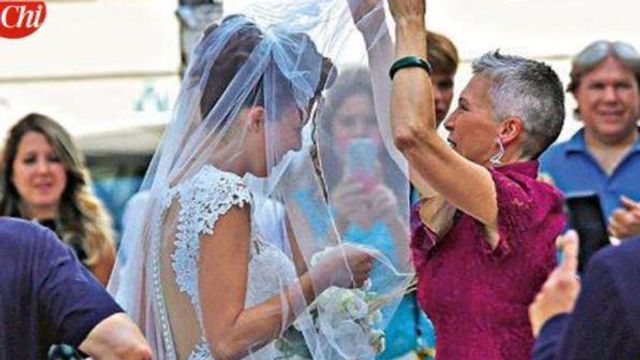 Scarpe coloratissime, abito che lascia intravedere le gambe, capelli cortissimi, orecchini pendenti, la Pivetti scopre il velo della figlia e non trattiene l'emozione. Insieme a lei alla cerimonia anche la sorella Veronica che ha optato per una mise sulle tonalità del grigio.