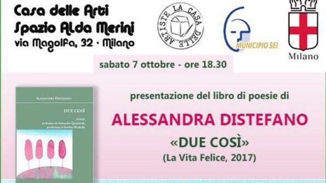 Sabato 7 ottobre, presso "Casa delle Arti - Spazio Alda Merini", si svolgerà la presentazione del terzo libro di poesie di Alessandra Distefano, intitolato "Due Così". L'autrice, farmacista e scrittrice, nata a Milano nel 1977, vive a Randazzo (Catania) dove, oltre a svolgere la sua professione, coltiva la passione per la scrittura, il suo più autentico modo per "assomigliare a se stessa". All’evento, come nelle precedenti presentazioni del libro, sarà presente l’autore della prefazione, Alessandro Quasimodo. Come il cognome fa intuire, Alessandro è figlio d’arte: Salvatore, insignito del premio Nobel per la letteratura nel 1959, era infatti sua padre. Quello che è meno risaputo, probabilmente, è che anche la madre, Maria Cumani, è stata una scrittrice, una traduttrice di opere classiche, tanto da essere prezioso e imprescindibile aiuto per il marito e, ancor prima, una ballerina talentuosa.