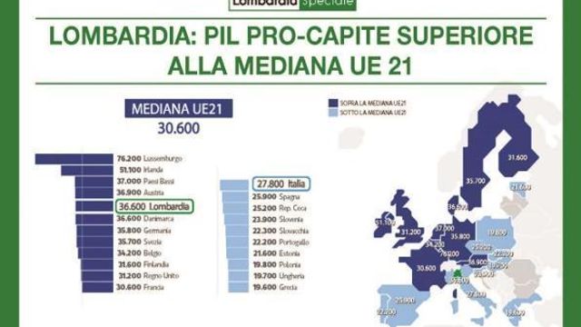 Il Prodotto Interno Lordo pro capite della Lombardia supera quello della Germania. La regione è al quinto posto in Europa, con 36.600 euro, al pari della Danimarca. Il valore è al di sopra della media europea (30.600 euro), davanti anche alla locomotiva tedesca, al sesto posto con 35.800 euro. Il report è stato rilasciato sul sito della regione in vista del referendum sull'autonomia, in programma per il 22 ottobre.