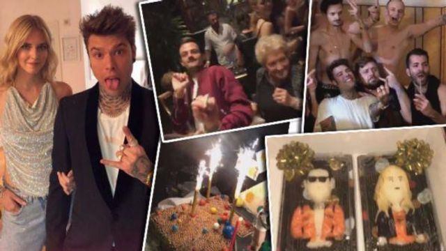 Poi l'immancabile torta di compleanno con tanto di candeline e una cascata di auguri da parte dei suoi amici vip presenti, tra cui: Arisa, Manuel Agnelli, Benji e Fede e Mika. Al fianco di Fedez la fidanzata Chiara Ferragni con un top argento luccicante e la schiena completamente nuda.