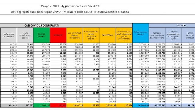 I numeri della pandemia Nei reparti ordinari sono ricoverate 25.587 persone, in calo di 782 unità rispetto alle 24 ore precedenti. In totale i casi da inizio epidemia sono 3.826.156, i morti 115.937. Gli attualmente positivi sono 510.023 (-4.637 rispetto a ieri). In isolamento domiciliare ci sono (481.019) persone (-3.782 rispetto a ieri).