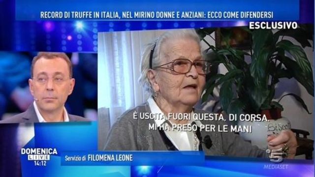A "Domenica Live" si parla di truffe agli anziani. In un servizio il racconto di Quirina, 89 anni, narcotizzata e derubata. “Ricordo di essere uscita di casa per prendere l’autobus ed è uscita questa donna che voleva aiutarmi, mi ha preso il braccio e mi ha trascinato indietro portandomi di nuovo in casa”. L'anziana rientrata in compagnia della donna è stata costretta a bere una bevanda contenente una droga. “Mi ha fatto bere del liquore, buono anzi buonissimo, ma subito ho sentito che c’era qualcosa che non andava”. La truffatrice l’ha quindi narcotizzata e poi derubata dei gioielli che aveva addosso. “Ho perso i sensi in ospedale e mi hanno preso più di 700 euro. A quelli che girano così toccherebbe prenderli e metterli dentro e buttare via la chiave”, ha dichiarato poi la signora.