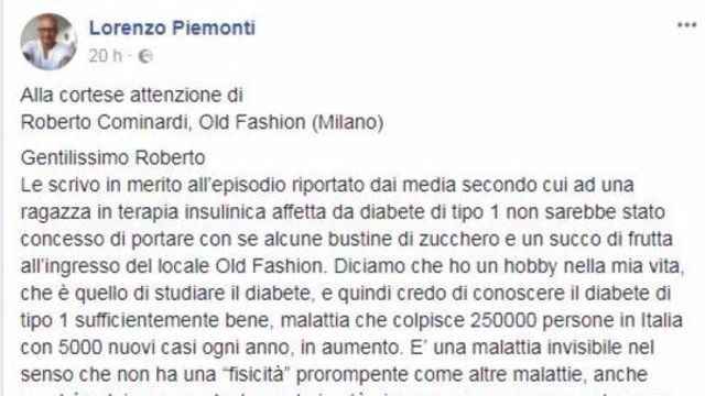 “Lo zucchero fa parte dell’armamentario terapeutico con cui una persona che soffre di diabete di tipo 1 gestisce la malattia. Parlare di rimedi della nonna è una stupidaggine”. Questo il commento del professor Lorenzo Piemonti, direttore dell’Istituto di Ricerca sul Diabete - DRI dell’Irccs Ospedale San Raffaele di Milano, in merito alla polemica scoppiata tra M.F., una 25enne diabetica di tipo 1, e il gestore della discoteca Old Fashion, Roberto Cominardi, in seguito alla scelta di un buttafuori del locale di non far entrare la ragazza perché portava con sé - nella borsetta - i suoi salvavita: tre bustine di zucchero e un succo di frutta. Il motivo? Nella discoteca non si possono portare cibi e bevande. Piemonti è rimasto colpito dall’episodio e ha scritto un post sul suo profilo Facebook per replicare alle parole di Cominardi, che aveva definito lo zucchero e il succo “rimedi della nonna”. Tgcom24 ha deciso di sentire direttamente il parere del professore.