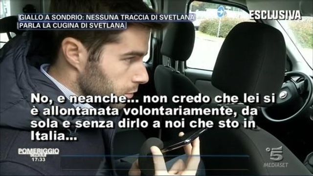 Giallo a Sondrio, nessuna traccia di Svetlana che dopo la morte del marito Nicola Pontiggia, 55enne di Cosio Valtellino trovato morto accanto al camion sul quale lavorava da anni nel piazzale della ditta Castelli a Morbegno, è scomparsa da 12 giorni. A Pomeriggio Cinque parla in esclusiva la cugina della 44enne moldava, l’ultima ad averla sentita al telefono: “Non credo che si sia allontanata volontariamente, io sono in Italia e poteva venire da me se aveva discusso col marito. Poi lei in Moldavia ha casa sua e poteva andare lì. Il matrimonio andava bene – aggiunge la donna - non so cosa possa essere successo, spero nulla di brutto”. La donna ha poi parlato al telefono del rapporto della coppia: “Lei e Nicola stavano insieme dal 2007 e andavano sempre d'accordo. Sono stata l’ultima ad aver sentito Svetlana il 29 ottobre, loro erano appena tornati dalla Moldavia e mi hanno raccontato come fosse andata. Eravamo rimasti che ci saremmo sentiti domenica sera, ma poi...”.
