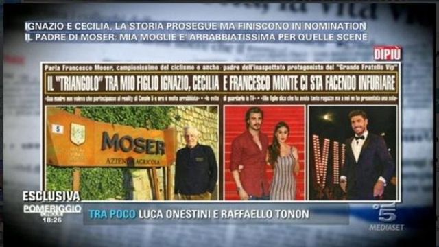 La storia tra Ignazio e Cecilia prosegue a gonfie vele, ma non mancano le polemiche all’interno e all’esterno della casa. I due, entrambi in nomination, rischiano di uscire dalla casa, ma a dare il colpo di grazia alla neo coppia è papà Moser che in esclusiva in un’intervista su DiPiù ha commentato il comportamento del figlio nella casa più spiata d’Italia: "Io sinceramente non lo seguo più molto perché non mi piace quel che vedo – ha detto il campione di ciclismo Francesco Moser – mia moglie Carla invece non lo segue proprio più, è arrabbiatissima per quelle scene e non riesce a sopportare di vederlo in tv in quel modo”. “Entrare al Grande Fratello è stata una sua scelta – aveva già dichiarato ai giornali papà Moser - poi vedremo le conseguenze. Ignazio sa come la pensiamo io e sua madre, deve restare nella normalità”.