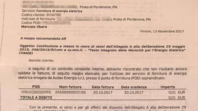 Spiacevolo sorpresa per una donna di Prata (Pordenone) che si è vista recapitare una lettera dal suo fornitore energetico, Audax Energia, di Vinovo (Torino), con la richiesta di saldare una bolletta non pagata dal valore di un centesimo.