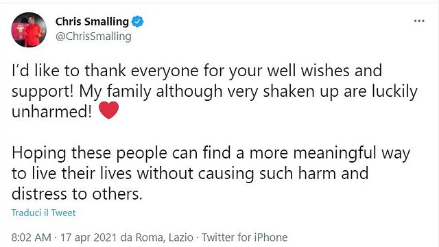 "Volevo ringraziare tutti per i messaggi di vicinanza e di supporto! La mia famiglia, sebbene molto scossa, è illesa. Spero che queste persone possano trovare un modo più significativo per vivere le loro vite, senza causare danni o angoscia agli altri", è il messaggio sui social del romanista Chris Smalling, all'indomani della rapina subita nella sua villa a Roma sull'Appia Pignatelli.